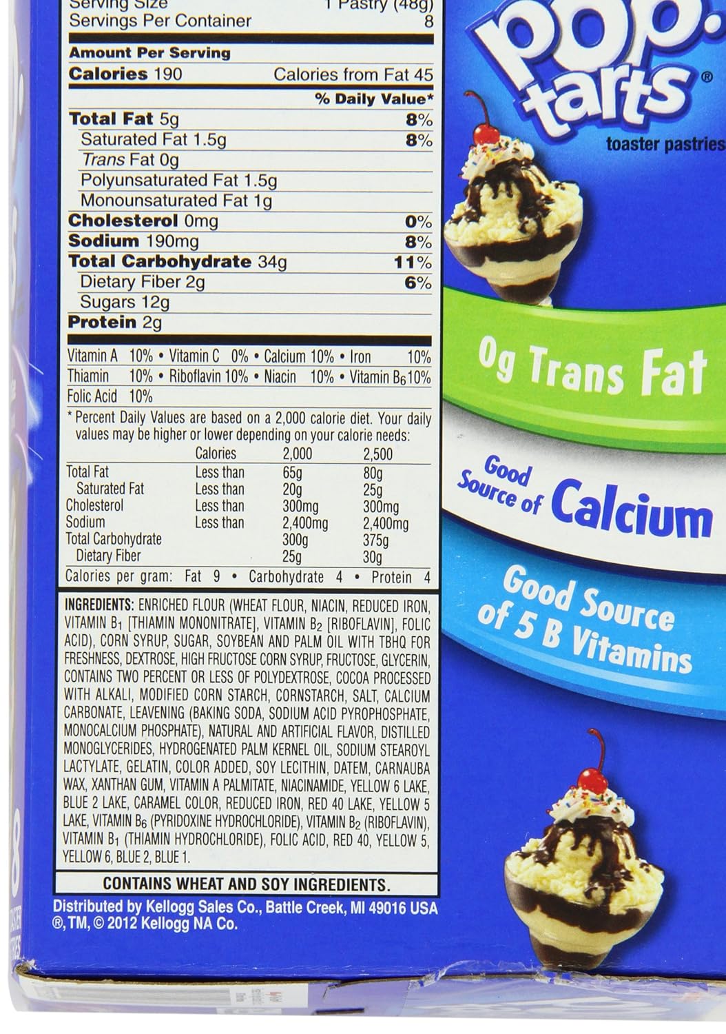 pop tarts calories, carbs & nutrition facts | MyFitnessPal Find calories, carbs, and nutritional contents for pop tarts and over 2,000,000 other foods at MyFitnessPal. Log In. Sign Up. About Food Exercise Apps Community Blog Premium. Pop Tarts. Pop tarts, 1 piece. ... Pop-Tarts, Frosted S'mores. Pop-Tarts, 1 pastry. Calories: ... Pop-Tarts Breakfast Toaster Pastries Frosted S'mores ingredients enriched flour (wheat flour, niacin, reduced iron, vitamin b1 [thiamin mononitrate], vitamin b2 [riboflavin], folic acid), sugar, high fructose corn syrup, dextrose, soybean and paint oil (with tbhq for freshness), corn syrup, whole wheat flour, bleached wheat flour, whey, contains 2% or less of molasses, cocoa processed with alkali, …