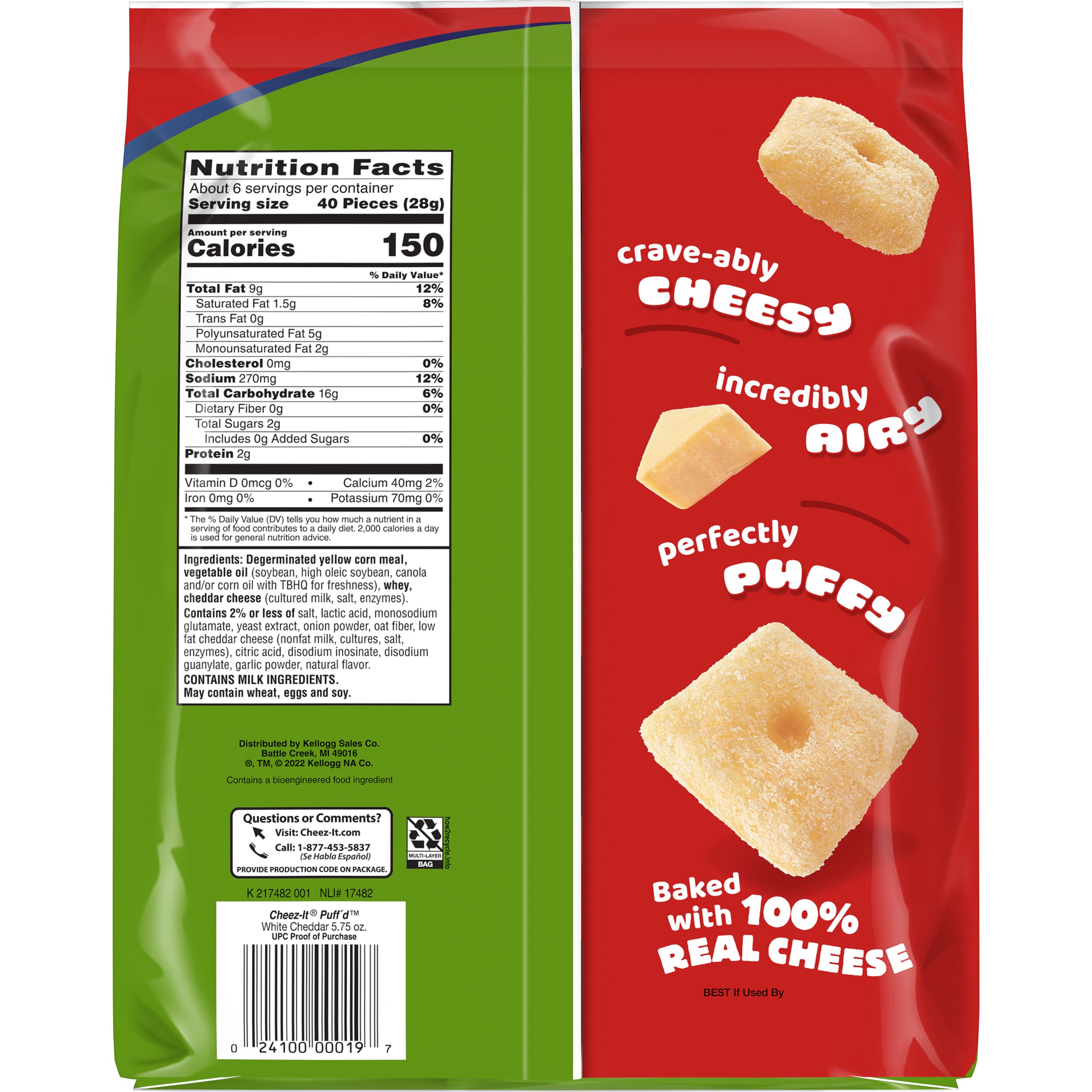 Lay's Potato Chips, Salt & Vinegar Flavor, 7.75 oz Bag ... Nutrition facts. Refer to the product label for full dietary information, which may be available as an alternative product image. ... Cheez-It Grooves Cheese Crackers ... PDF Official Nutrition Label Information Cheez-It made with Whole Grain ... 21WHOLE WHEAT FLOUR, ENRICHED FLOUR (WHEAT FLOUR, NIACIN, REDUCED IRON, VITAMIN B1 [THIAMIN MONONITRATE], VITAMIN B2 [RIBOFLAVIN], FOLIC ACID), WHITE CHEDDAR CHEESE (MILK, CHEESE CULTURES, SALT, ENZYMES), SOYBEAN OIL WITH TBHQ FOR FRESHNESS, CONTAINS TWO PERCENT OR LESS OF SALT, CALCIUM CARBONATE, PAPRIKA, YEAST, PAPRIKA OLEORESIN FOR COLOR, TUR... PDF CHEEZ-IT Nutrition Facts SUNSHINE CHEEZ-IT ORIGINAL .75OZ 175CT Product Last Saved Date:30 May 2017 Nutrition Facts Serving Size: Number of Servings per Amount Per Serving Calories: Calories from Fat: ... Gross Weight Net Weight Country of Origin Kosher Child Nutrition 10.246 LBR 8.203 LBR USA Yes Shipping Information