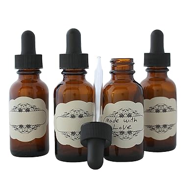 PrettyCare dropper bottle 1 oz (4 bottles of 30 ml clear glass bottle with golden cap, 1 extra plastic measuring pipette, 12 labels, funnel) empty ...