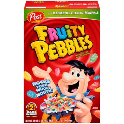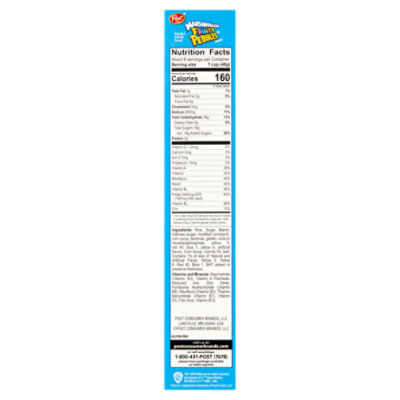 Post Fruity Pebbles Cereal Family Size - H-E-B Ingredients Rice, Sugar, Hydrogenated Vegetable Oil (Coconut and Palm Kernel Oils), Salt, Contains Less than 0.5% of Natural and Artificial Flavor, Red 40, Yellow 6, Turmeric Oleoresin (Color), Blue 1, Yellow 5, Blue 2, BHA (to Help Protect Flavor).