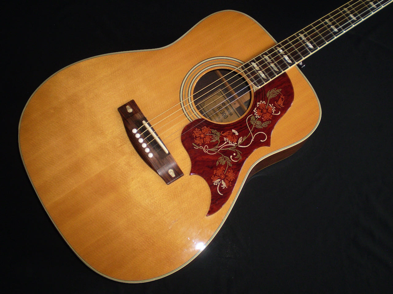 1960s Yamaha FG-300 Jumbo Flattop Guitar - Blogger 1960s Yamaha FG-300 (MIJ, Japan-made) jumbo flattop guitar Watch on This "red label" FG-300 was probably built in '69 or '70. At the time, this was the fanciest Yamaha jumbo you could buy and it's kitted-out with a nice hummingbird-style pickguard, cool inlay in the board, binding all over the place, and ply-rosewood back and sides.