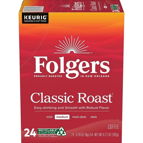 Folgers Classic Roast® Coffee | Folgers® Folgers Classic Roast® Coffee 4.3 (806) Write a review Wake up to the fresh aroma of Folgers Classic Roast® coffee. Each sip delivers the rich, smooth flavor that's been brewing for generations. Experience the timeless tradition of Folgers in every cup. ♲ This product can be recycled*. *Not recycled in all communities. Mild Medium Med-Dark Dark