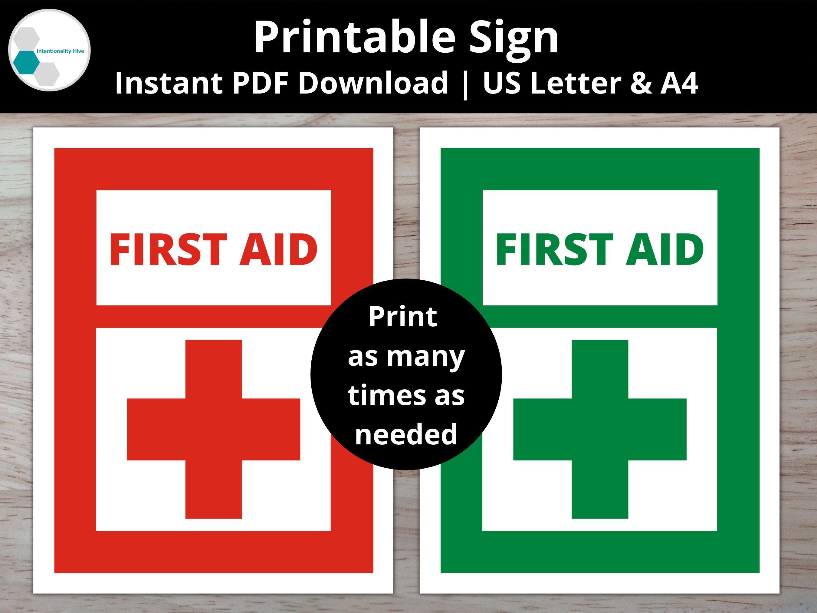 First Aid Signs Printable | FREE Download First Aid Signs Printable | FREE Download Ready Made Free to download and print. Or, download the editable Full Pack of 15 Signs for just $2.99 What's the difference? Downloads are subject to this site's term of use. Explore More Emergency Sign. PDF format: Paper size: US Letter. Dimensions: 8.5 x 11 inch. Orientation: portrait, vertical.