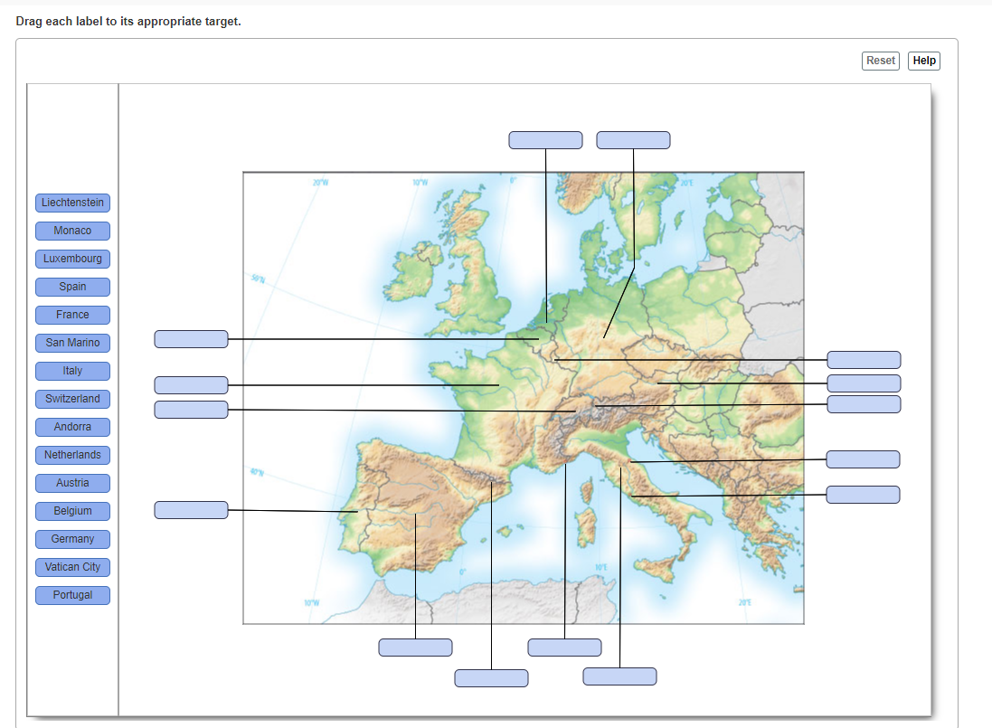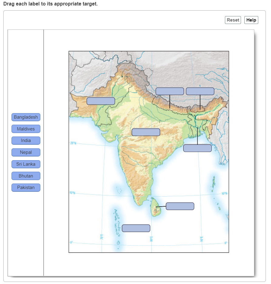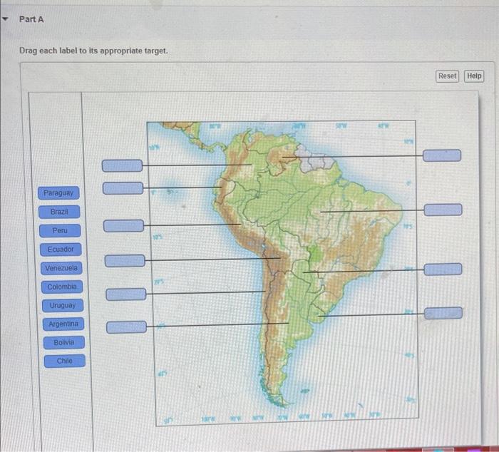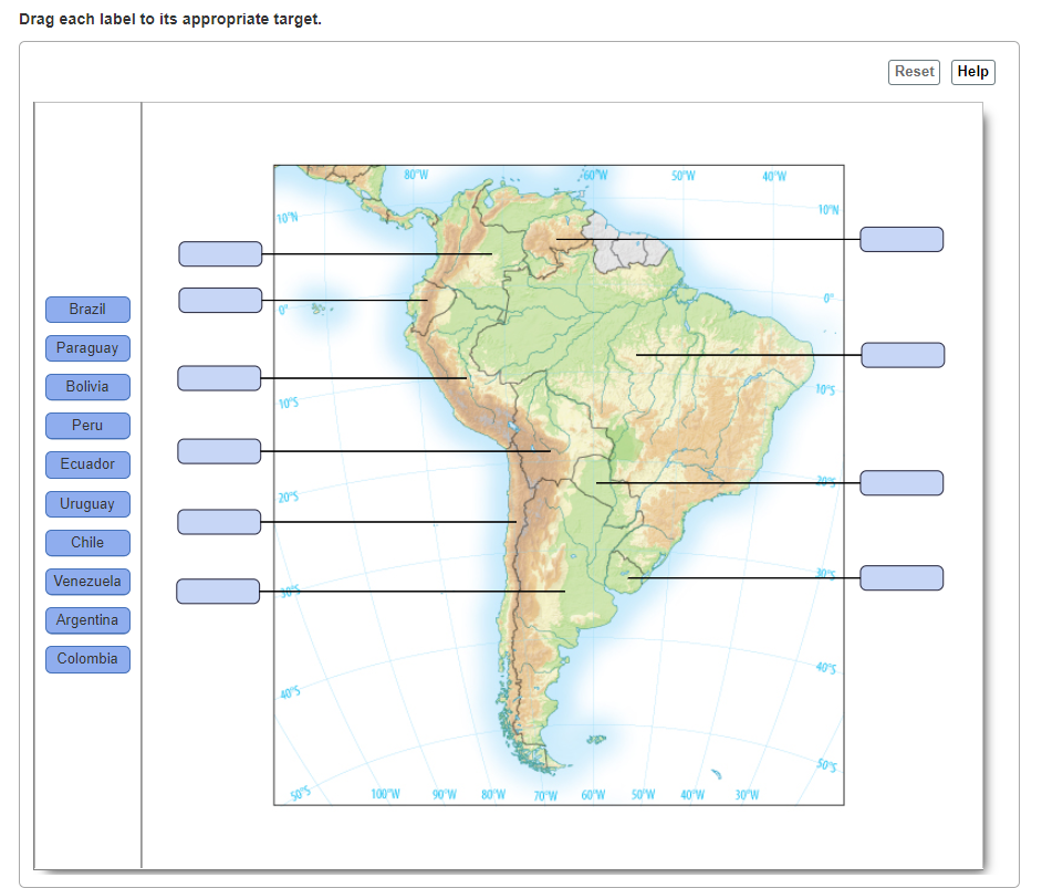 Solved Drag each label to its appropriate target. Reset Help - Chegg Question: Drag each label to its appropriate target. Reset Help 80 W 60 W 50 W 40°W 10 N 10N Brazil Paraguay Bolivia 10'S 1095 Peru DU U U U Ecuador 2005 ...