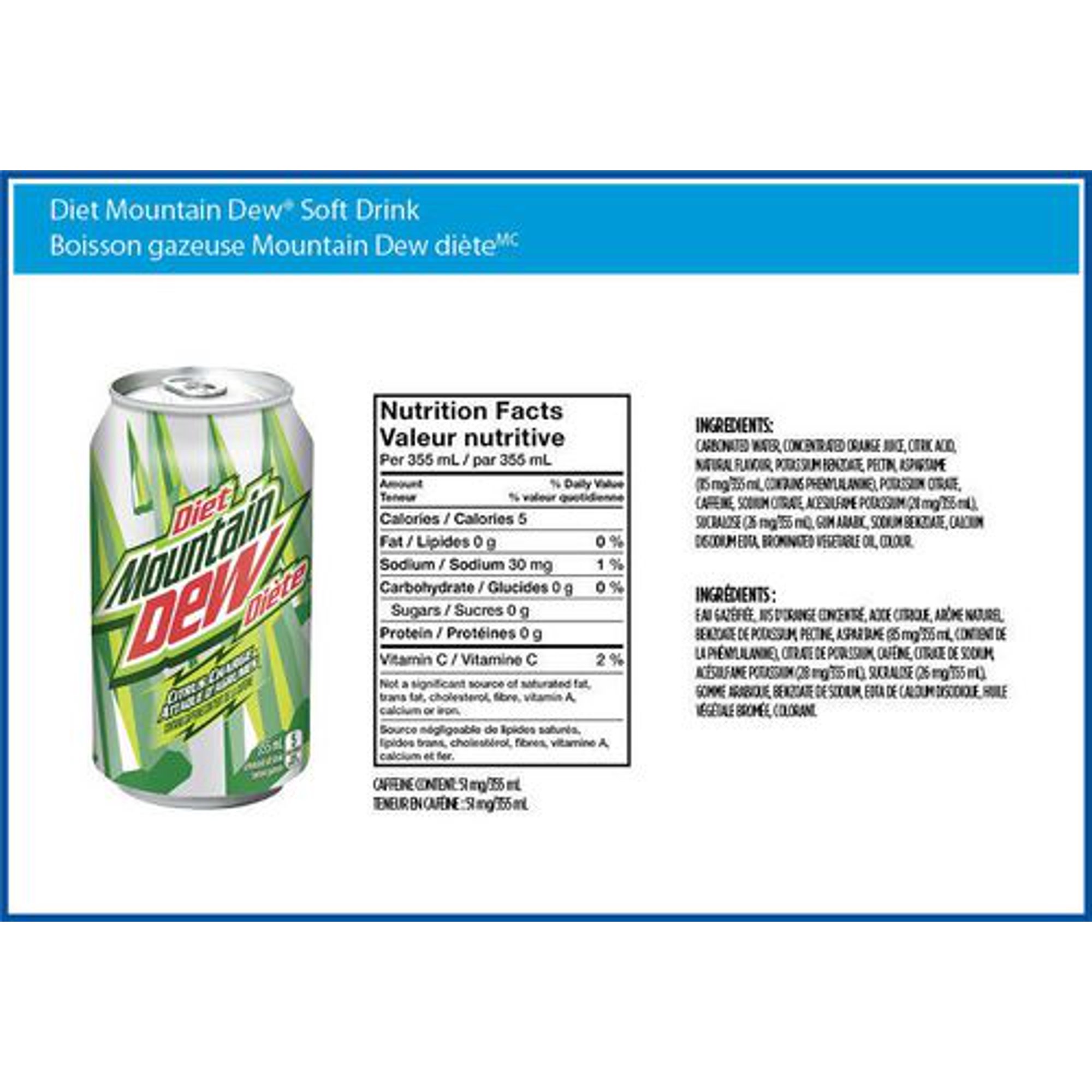 Diet mountain dew ingredients label. Diet Mountain Dew® Soda Bottle, 20 fl oz - Kroger 2,000 calories a day is used for general nutrition advice. Ingredients Carbonated Water, Concentrated Orange Juice, Citric Acid, Natural Flavor, Potassium ... Calories in Fl Oz Diet Mountain Dew - Nutritionix The % Daily Value (DV) tells you how much a nutrient in a serving of food contributes to a daily diet. 2000 calories a day is used for general nutrition advice. Diet Mountain Dew Soda, 8 cans / 7.5 fl oz - Kroger 2,000 calories a day is used for general nutrition advice. Ingredients Carbonated Water, Concentrated Orange Juice, Citric Acid, Natural Flavor, Citrus Pectin, ... Diet Mountain Dew Soda - 12/12 oz. Cans - Coborns Ingredients. Carbonated Water, Concentrated Orange Juice, Citric Acid, Natural Flavor, Potassium Benzoate (Preserves Freshness), Citrus Pectin, Aspartame, ...