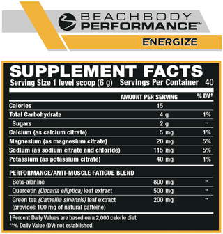 Beachbody Performance Energize | Team Beachbody US Key ingredients in Energize are scientifically shown to help:* Increase energy and endurance Improve intense exercise performance Sharpen focus and reaction time Delay exercise-induced muscle fatigue Increase muscle power output $54.95 Retail Price Your Price $54.95 USD + s&h Learn More About What You Get Ingredients Guarantee Success Stories