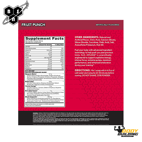 › supplements › 41-bsn-noNO-Xplode ingredients - supplementarium.com Other Ingredients Citric Acid, Natural & Artificial Flavors, Calcium Silicate, Potassium Citrate, Sucralose(Splenda Directions Recommended Use On Training Days: Once your tolerance has been established, mix 1-3 scoops with 5-18 oz of cold water and consume 30-45 minutes before training. Use approximately 5-6 oz of water per 1 scoop of powder.